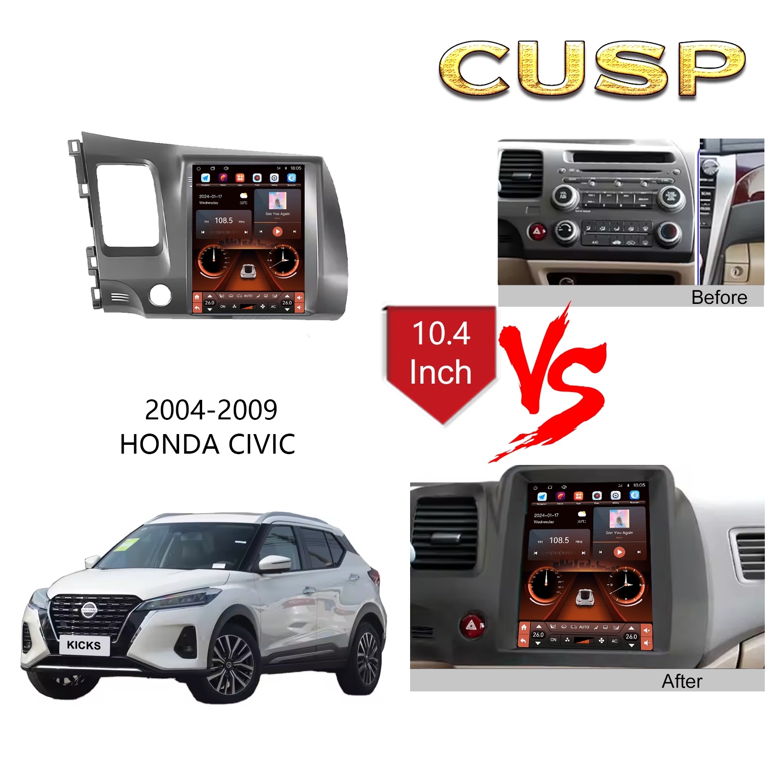 CUSP HONDA CIVIC 2004-2009 9.7 Inch 9.7 Inch HD IPS Screen Android Car Stereo Radio GPS Navigation Multimedia Player Tablet Tesla Style Vertical Screen with Car Play and Android Auto, Bluetooth,FM,AM