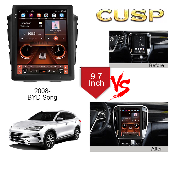 BYD SONG 2018- 9.7 Inch HD IPS Screen Android Car Stereo Radio GPS Navigation Multimedia Player Tesla Style Vertical Screen with Car Play and Android Auto, Bluetooth,FM,AM, RDS, GPS, WIFI, DSP, Audio, Video,Google, Youtube, Play Store, Netflix, Support Rear Camera,in Dash Kit