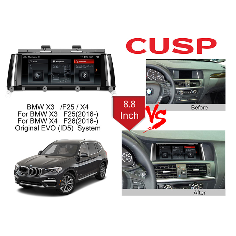 CUSP BMW X3 /F25 /X4 For BMW X3 F25 (2017-) For BMW X4 F26 (2017-) Original EVO (ID5) System 8.8 Inch HD IPS Screen Android Car Stereo Radio GPS Navigation Multimedia Player Tablet with Car Play and Android Auto, Bluetooth,FM,AM, RDS, GPS, WIFI, DSP, Audio, Video,Google, Youtube, Play Store, Netflix, Support Rear Camera,in Dash Kit