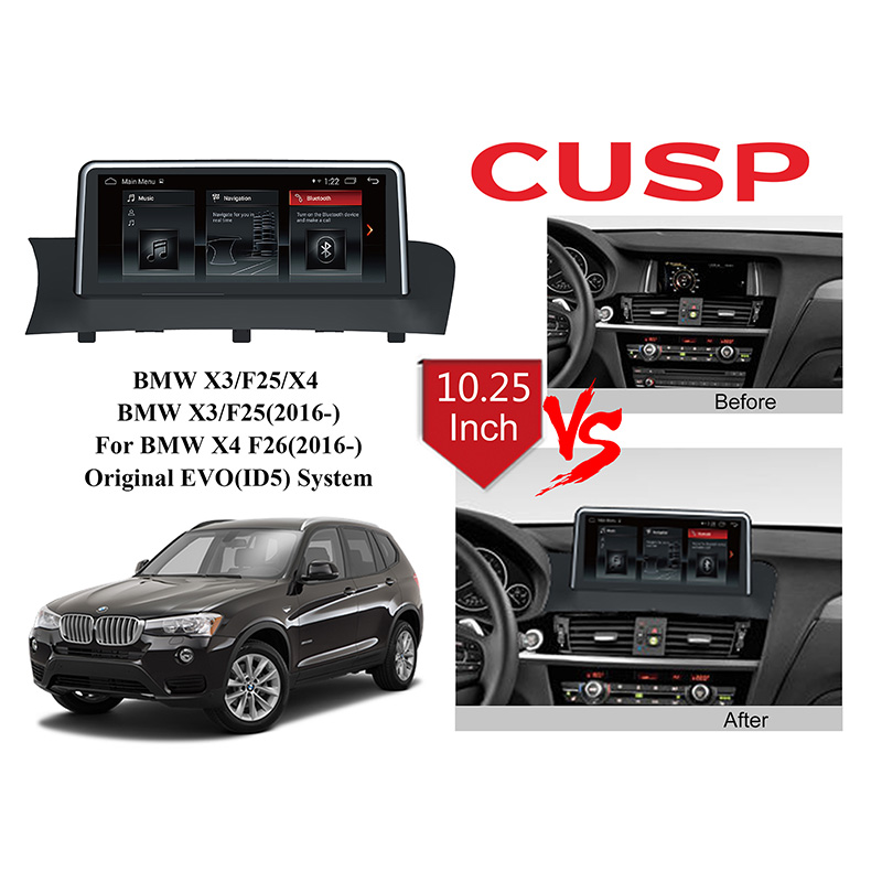 CUSP BMW X3 /F25 /X4 For BMW X3 F25 (2016-) For BMW X4 F26 (2016-) Original EVO (ID5) System 10.25 Inch HD IPS Screen Android Car Stereo Radio GPS Navigation Multimedia Player Tablet with Car Play and Android Auto, Bluetooth,FM,AM, RDS, GPS, WIFI, DSP, Audio, Video,Google, Youtube, Play Store, Netflix, Support Rear Camera,in Dash Kit
