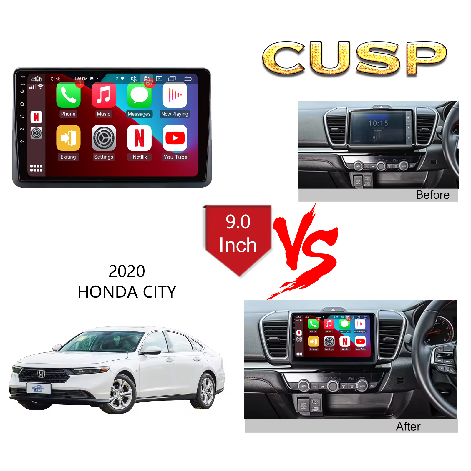CUSP HONDA CITY 2020 9 Inch HD IPS Screen Android Car Stereo Radio GPS Navigation Multimedia Player Tablet with Car Play and Android Auto, Bluetooth,FM,AM, RDS, GPS, WIFI, DSP, Audio, Video,Google, Youtube, Play Store, Netflix, Support Rear Camera,in Dash Kit