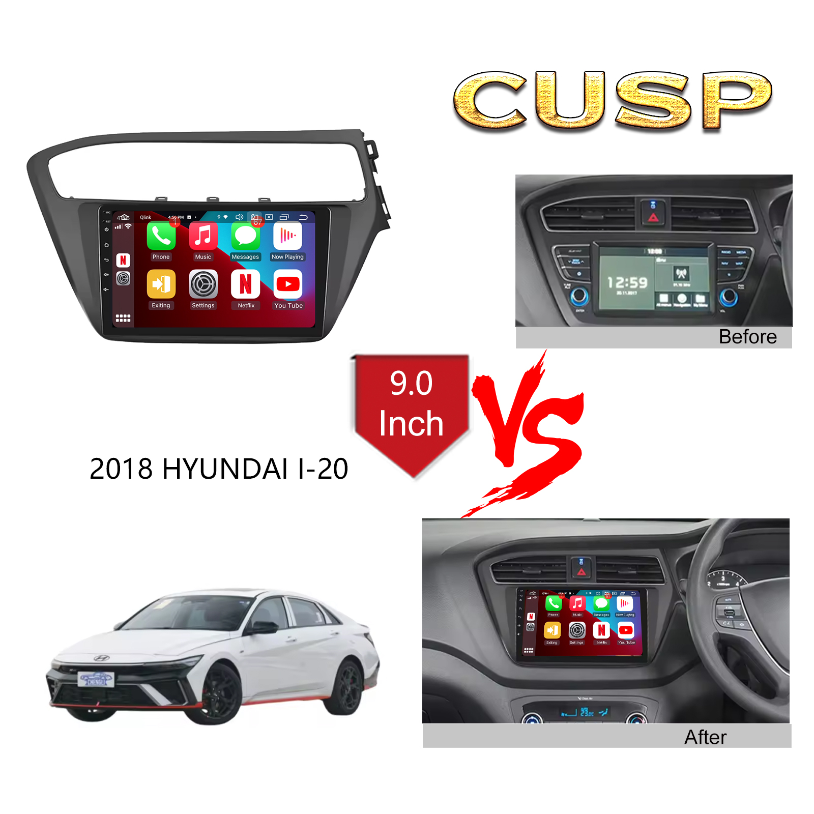 CUSP HYUNDAI I-20 2018 RHD 9 Inch HD IPS Screen Android Car Stereo Radio GPS Navigation Multimedia Player Tablet with Car Play and Android Auto, Bluetooth,FM,AM, RDS, GPS, WIFI, DSP, Audio, Video,Google, Youtube, Play Store, Netflix, Support Rear Camera,in Dash Kit