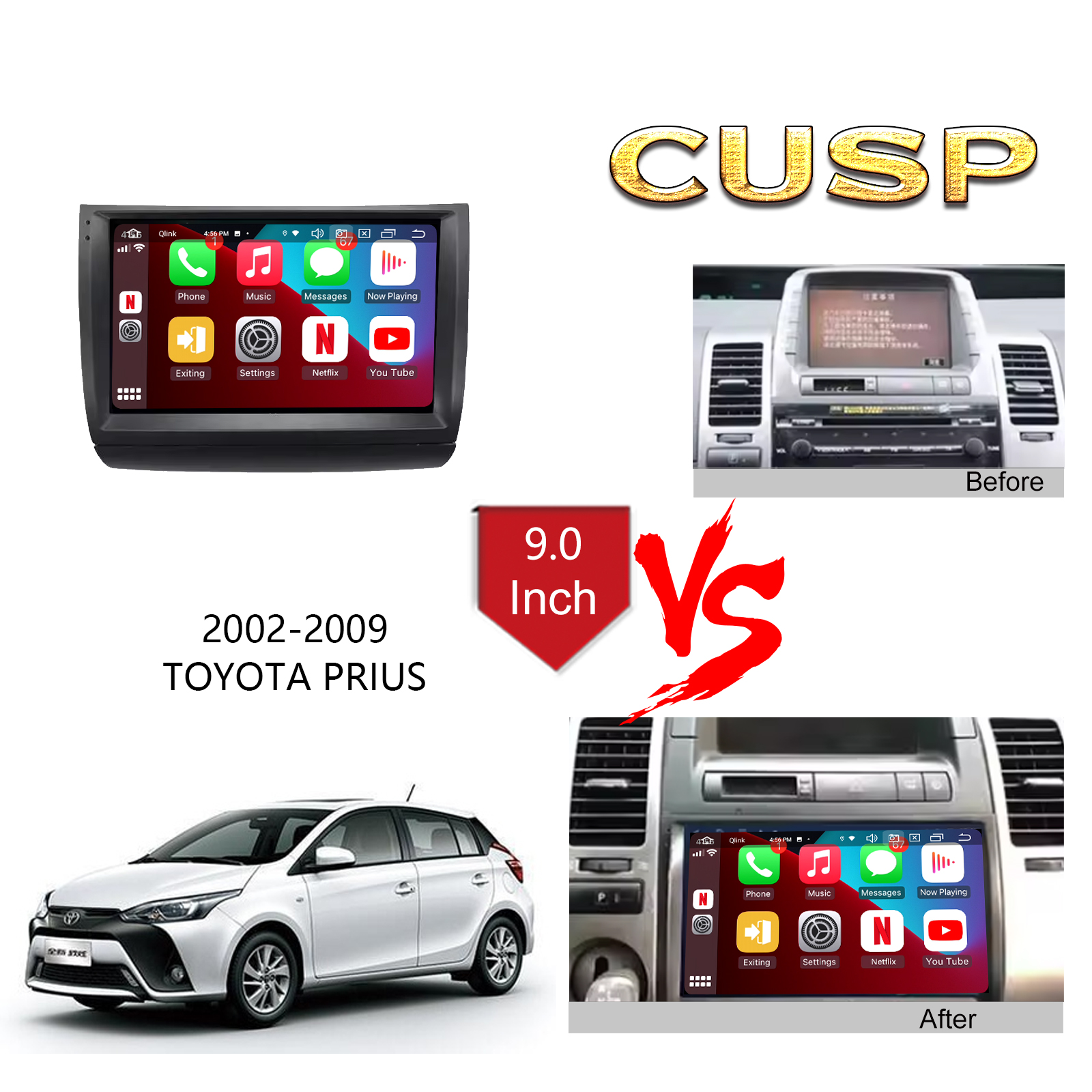 CUSP TOYOTA PRIUS 2002-2009 9 Inch HD IPS Screen Android Car Stereo Radio GPS Navigation Multimedia Player Tablet with Car Play and Android Auto, Bluetooth,FM,AM, RDS, GPS, WIFI, DSP, Audio, Video,Google, Youtube, Play Store, Netflix, Support Rear Camera,in Dash Kit