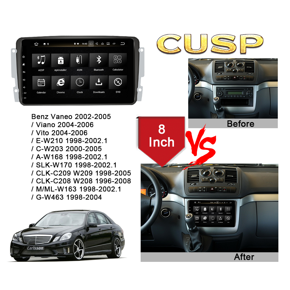 CUSP Benz Vaneo 2002-2005 / Viano 2004-2006 / Vito 2004-2006 / E-W210 1998 2002.1 / C-W203 2000-2005/ A-W168 1998-2002 8 Inch HD IPS Screen Android Car Stereo Radio GPS Navigation Multimedia Player Tablet with Car Play and Android Auto, Bluetooth,FM,AM, RDS, GPS, WIFI, DSP, Audio, Video,Google, Youtube, Play Store, Netflix, Support Rear Camera,in Dash Kit