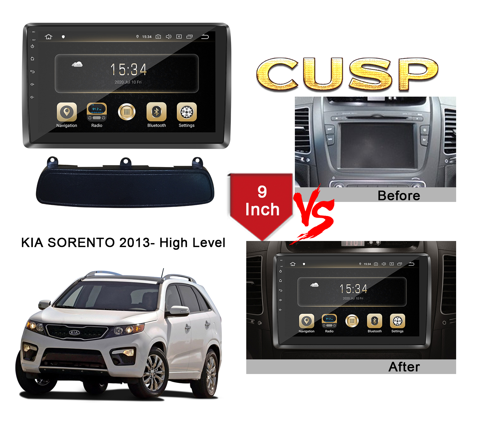 CUSP KIA SORENTO 2013- 9 Inch HD IPS Screen Android Car Stereo Radio GPS Navigation Multimedia Player Tablet with Car Play and Android Auto, Bluetooth,FM,AM, RDS, GPS, WIFI, DSP, Audio, Video,Google, Youtube, Play Store, Netflix, Support Rear Camera,in Dash Kit