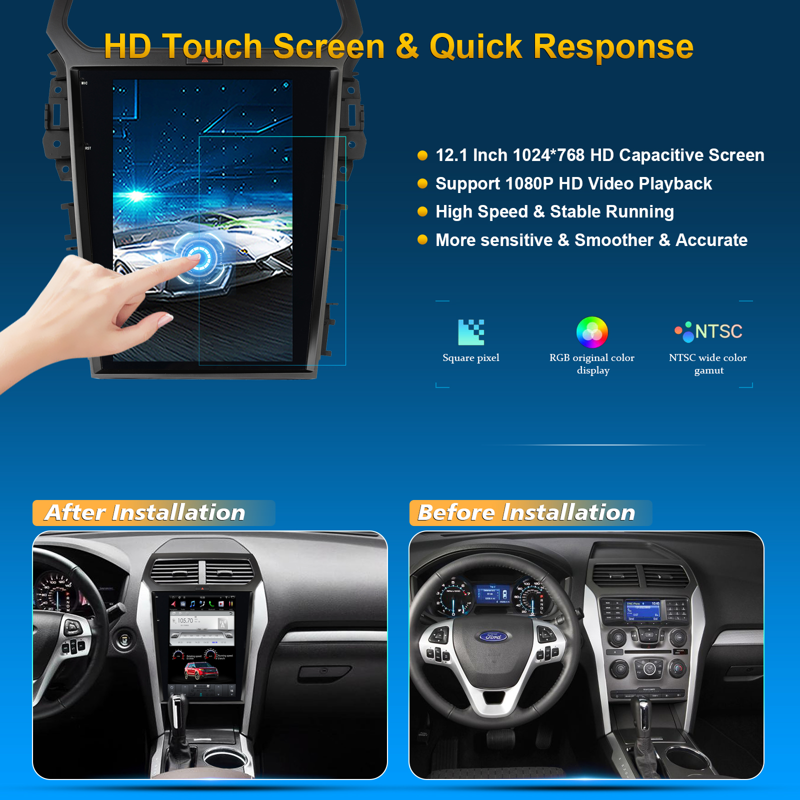 CUSP Ford Explorer 2011-2015 AUTO A/C 2011-2015/MANUAL A/C /2016-2019 MANUAL A/C / 2016-2019 AUTO A/C 12.1 Inch HD IPS Screen Android Car Stereo Radio GPS Navigation Multimedia Player Tesla Style Vertical Screen with Car Play and Android Auto, Bluetooth,FM,AM, RDS, GPS, WIFI, DSP, Audio, Video,Google, Youtube, Play Store, Netflix, Support Rear Camera,in Dash Kit