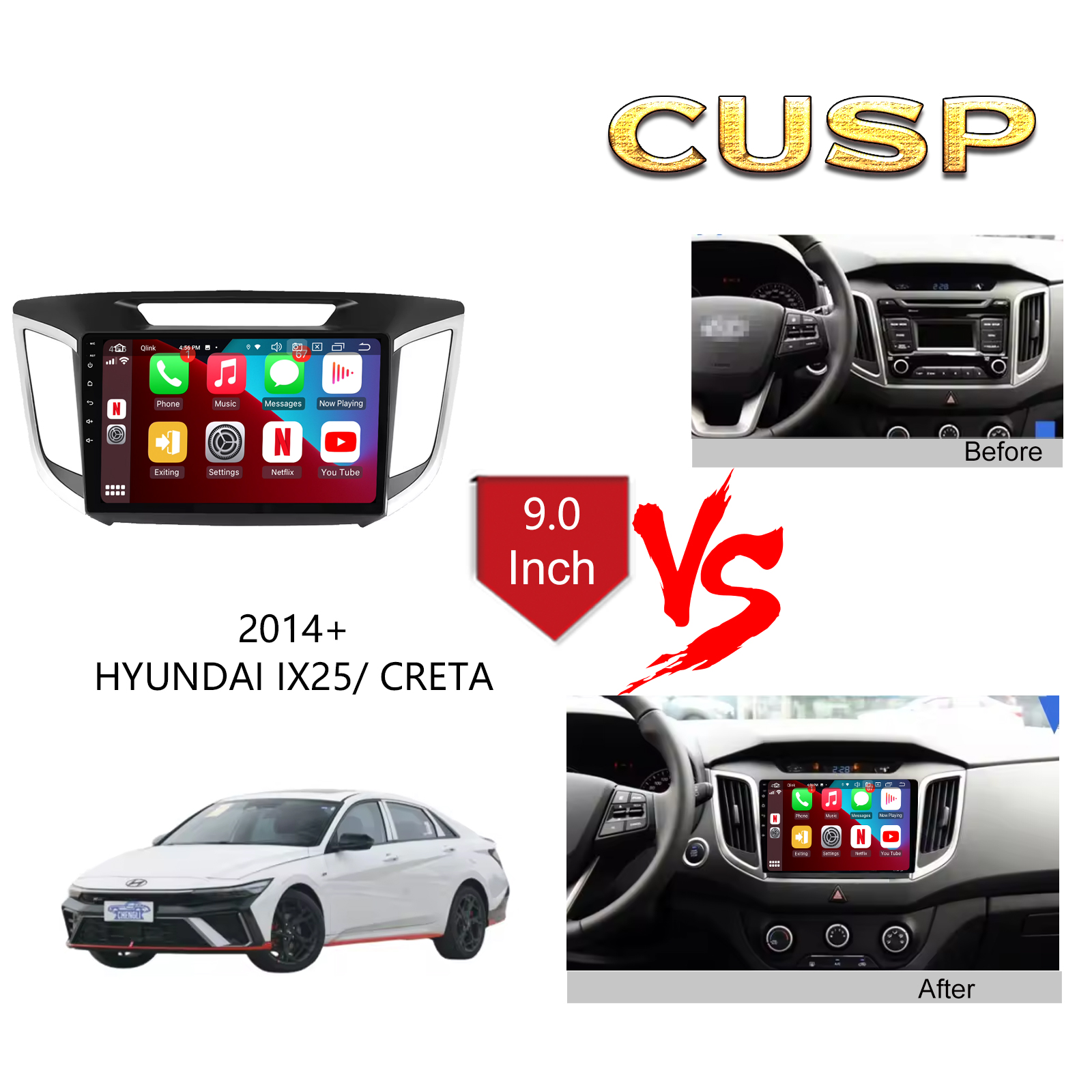 CUSP HYUNDAI IX25/ CRETA 2014+ 9 Inch HD IPS Screen Android Car Stereo Radio GPS Navigation Multimedia Player Tablet with Car Play and Android Auto, Bluetooth,FM,AM, RDS, GPS, WIFI, DSP, Audio, Video,Google, Youtube, Play Store, Netflix, Support Rear Camera,in Dash Kit