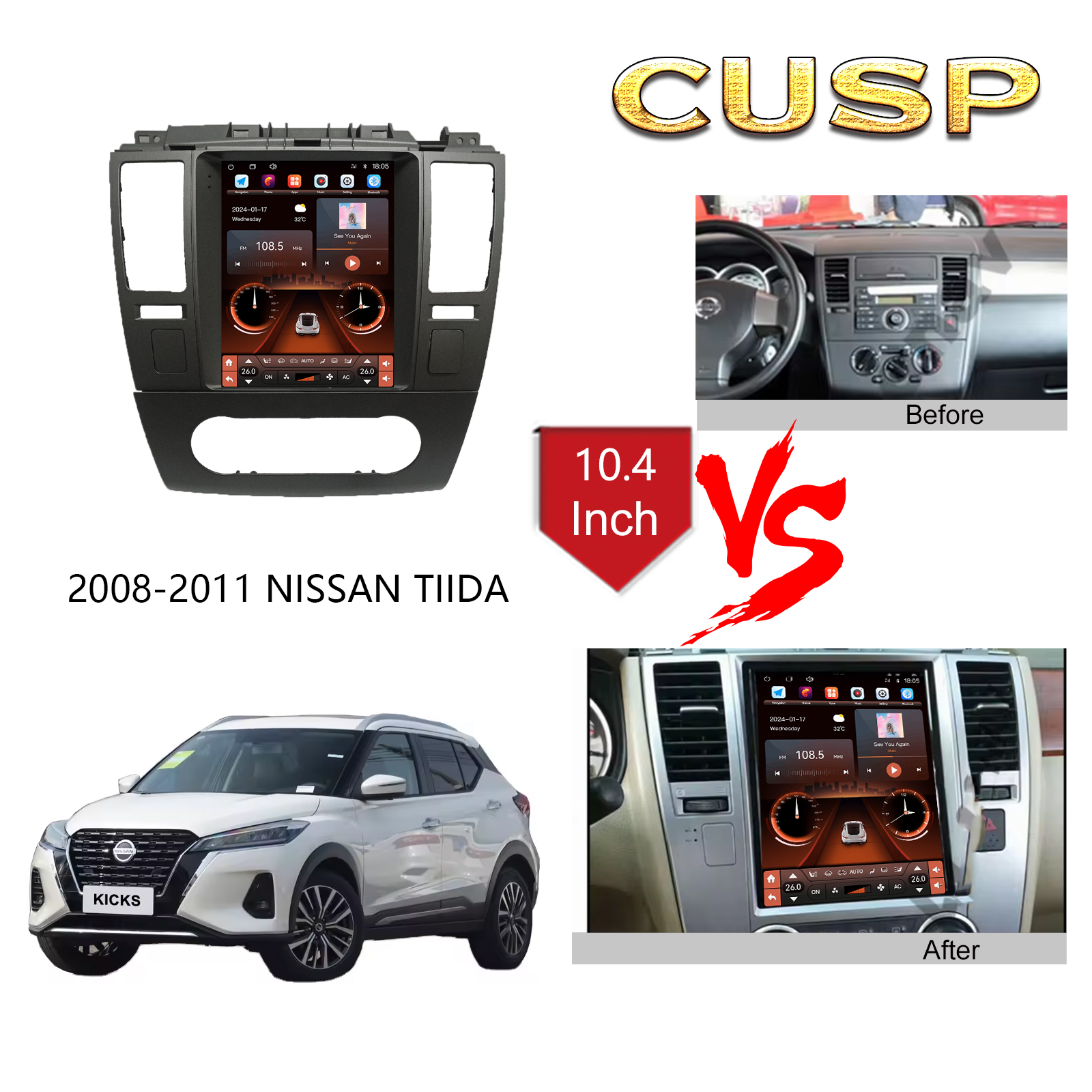 2008-2011 NISSAN TIIDA 9.7 Inch HD IPS Screen Android Car Stereo Radio GPS Navigation Multimedia Player Tesla Style Vertical Screen with Car Play and Android Auto, Bluetooth,FM,AM, RDS, GPS, WIFI, DSP, Audio, Video,Google, Youtube, Play Store, Netflix, Support Rear Camera,in Dash Kit