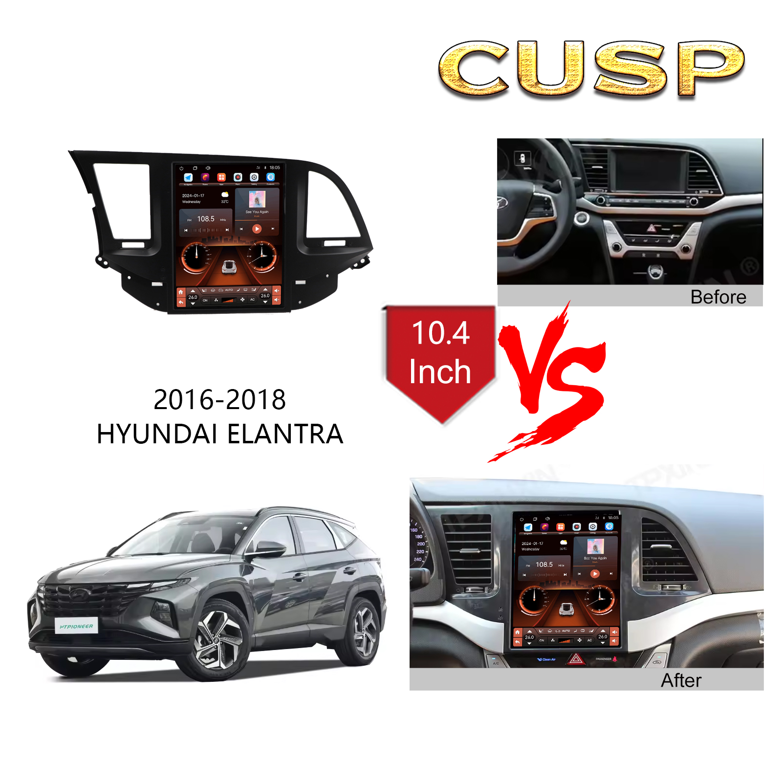 CUSP HYUNDAI ELANTRA 2016-2018 9.7 Inch HD IPS Screen Android Car Stereo Radio GPS Navigation Multimedia Player Tablet Tesla Style Vertical Screen with Car Play and Android Auto, Bluetooth,FM,AM, RDS, GPS, WIFI, DSP, Audio, Video,Google, Youtube, Play Store, Netflix, Support Rear Camera,in Dash Kit