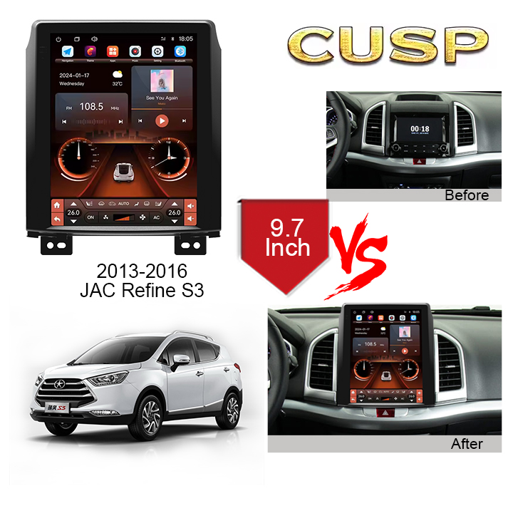 JAC REFINE S3 2013-2016 9.7 Inch HD IPS Screen Android Car Stereo Radio GPS Navigation Multimedia Player Tesla Style Vertical Screen with Car Play and Android Auto, Bluetooth,FM,AM, RDS, GPS, WIFI, DSP, Audio, Video,Google, Youtube, Play Store, Netflix, Support Rear Camera,in Dash Kit