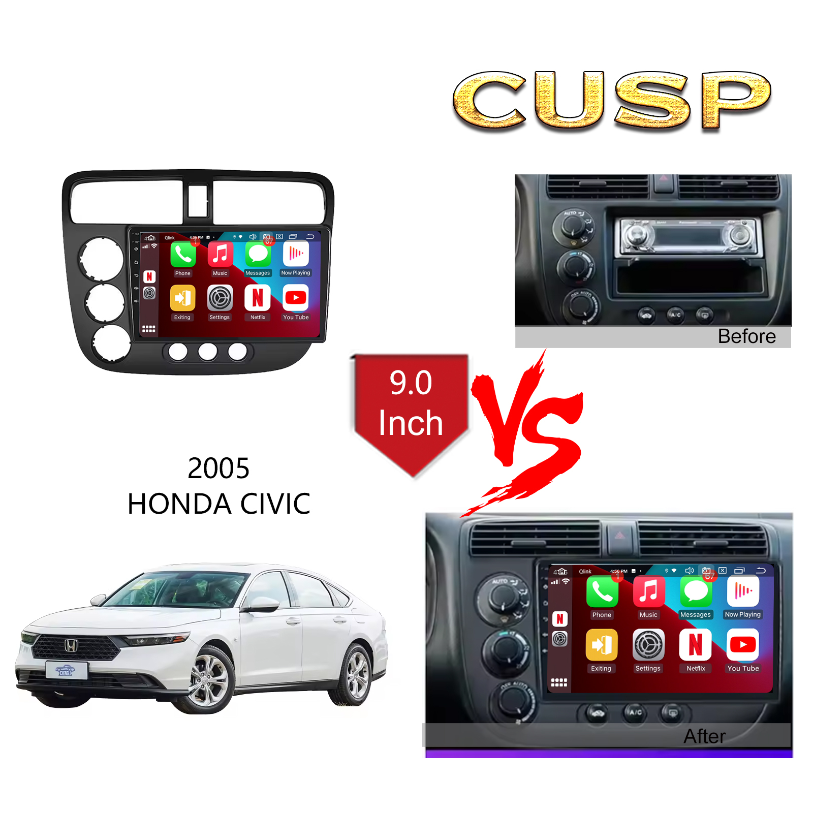 CUSP HONDA CITY 2005 LHD MANUAL AC 9 Inch HD IPS Screen Android Car Stereo Radio GPS Navigation Multimedia Player Tablet with Car Play and Android Auto, Bluetooth,FM,AM, RDS, GPS, WIFI, DSP, Audio, Video,Google, Youtube, Play Store, Netflix, Support Rear Camera,in Dash Kit