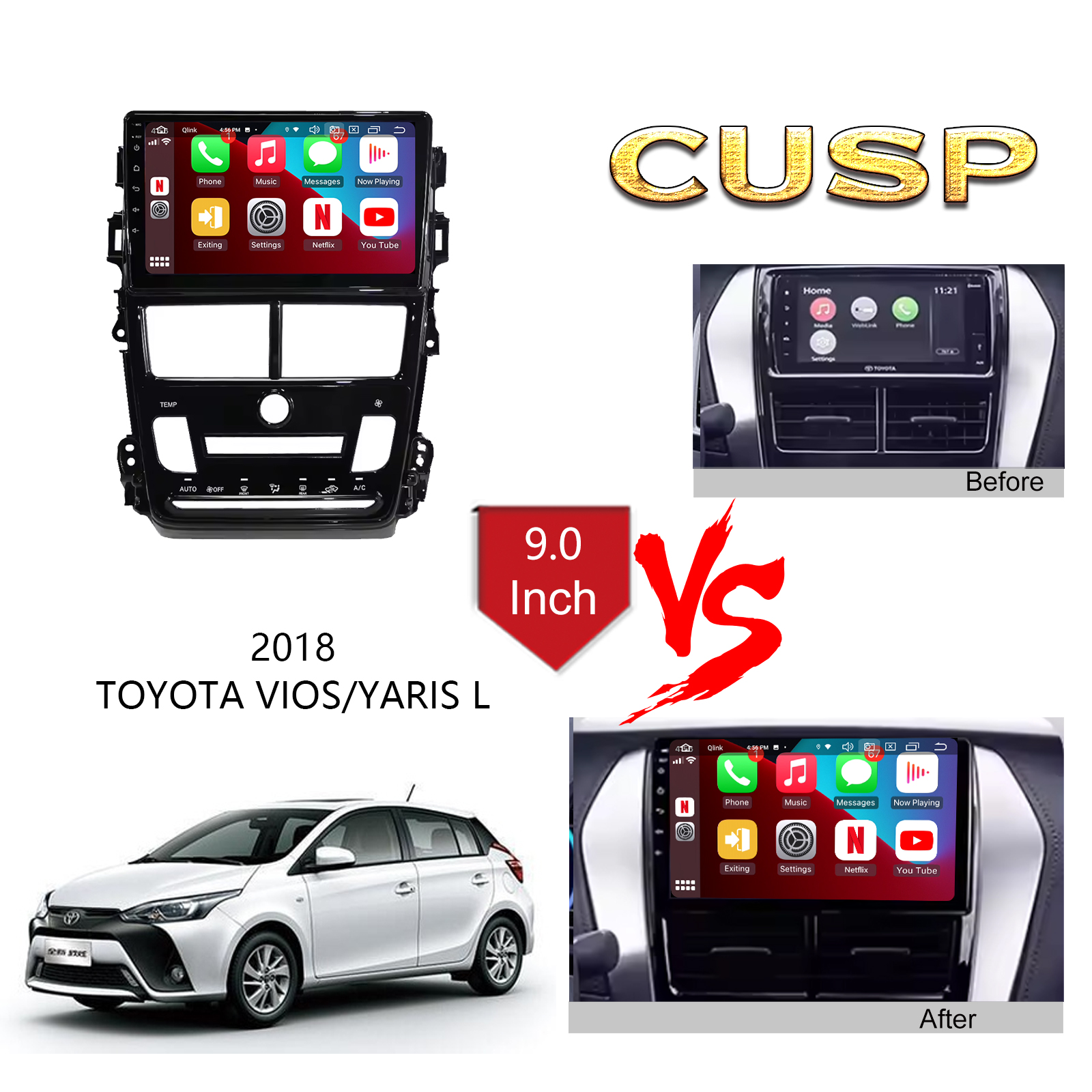 CUSP TOYOTA VIOS/ YARIS 2018+ AUTO AC 9 Inch HD IPS Screen Android Car Stereo Radio GPS Navigation Multimedia Player Tablet with Car Play and Android Auto, Bluetooth,FM,AM, RDS, GPS, WIFI, DSP, Audio, Video,Google, Youtube, Play Store, Netflix, Support Rear Camera,in Dash Kit