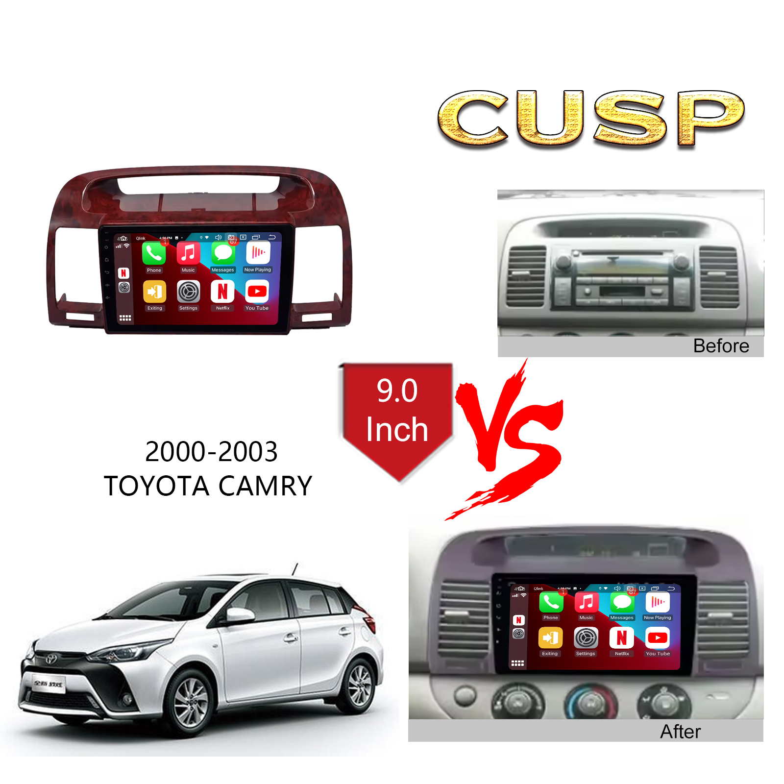 CUSP TOYOTA CAMRY 2000-2003 9 Inch HD IPS Screen Android Car Stereo Radio GPS Navigation Multimedia Player Tablet with Car Play and Android Auto, Bluetooth,FM,AM, RDS, GPS, WIFI, DSP, Audio, Video,Google, Youtube, Play Store, Netflix, Support Rear Camera,in Dash Kit