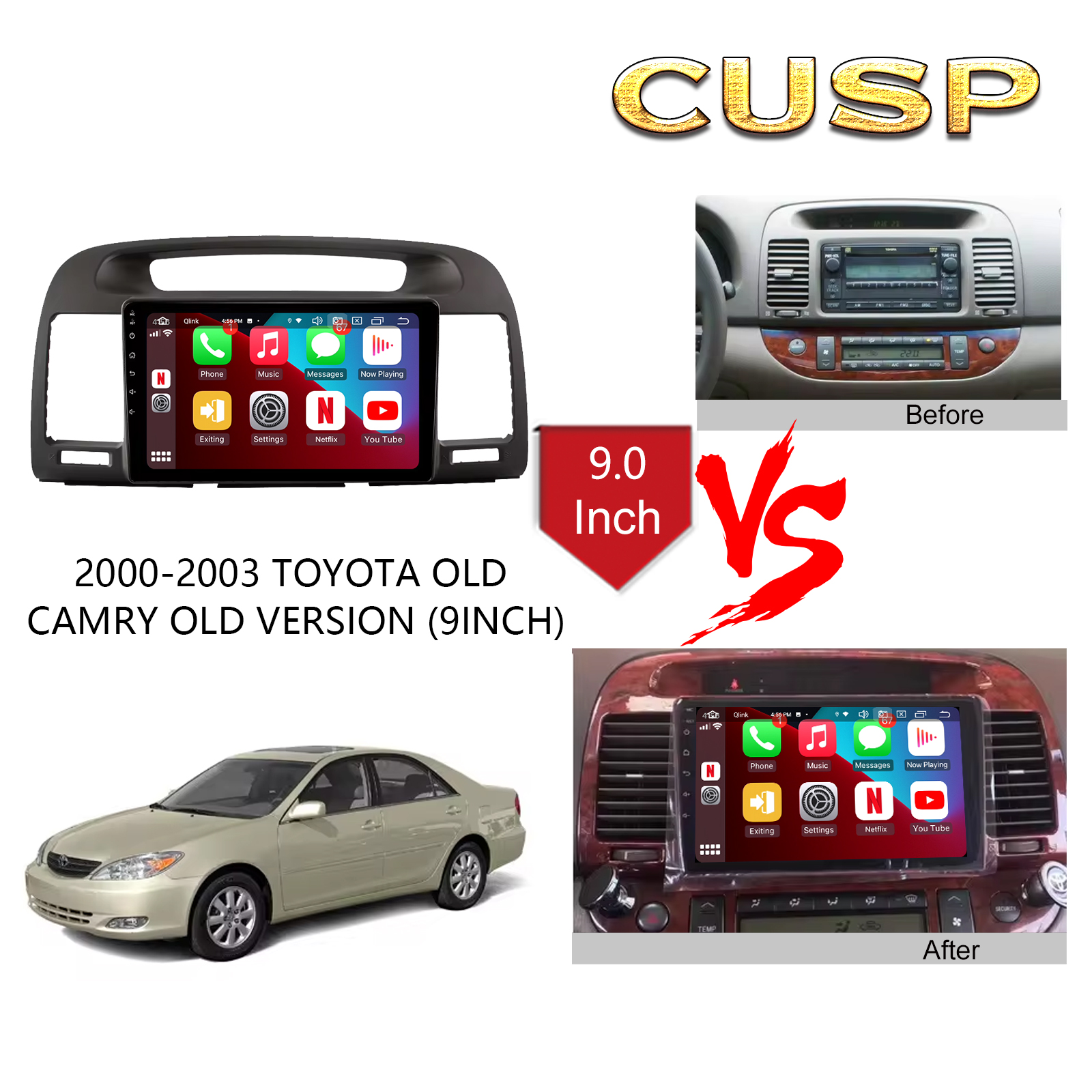 CUSP TOYOTA CAMRY 2000-2003 9 Inch HD IPS Screen Android Car Stereo Radio GPS Navigation Multimedia Player Tablet with Car Play and Android Auto, Bluetooth,FM,AM, RDS, GPS, WIFI, DSP, Audio, Video,Google, Youtube, Play Store, Netflix, Support Rear Camera,in Dash Kit